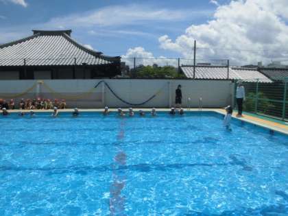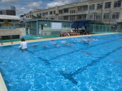 暑い一日になりました。1、2年生が自分の力試しで横(15mくらい)をバタ足などでたどり着けるか挑戦していました。顔をつけるのも苦労していた子ども達も浮いたり,バタ足で進んだりできるようになっています。人と比べるのではなく自分の力を試していくいい運動だと思います。みんないい顔をしていました。
