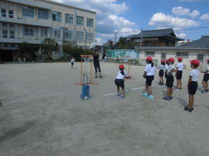 中学年はフープやボールを使ったバラエティ走をします。今日は説明とそれぞれの練習をグループに分かれてやっていました。「フープを回して跳ぶ」「フープでボールを運ぶ」「ボールを投げてゴムひもの向こう側で受ける」「ボールをシュートする」の4種類です。楽しそうに練習していました。