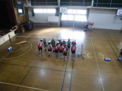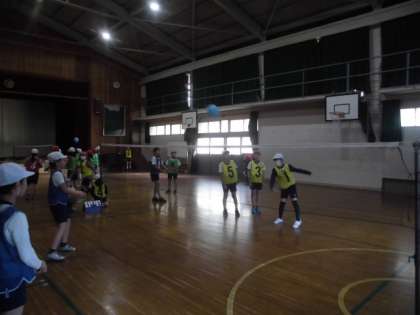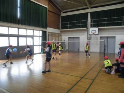 5年生のソフトバレーボールの学習です。3人でコートに入り,サーブは失敗したら2回できます。強いサーブだとまがってしまうため,コントロールよく入ったボールは結構返しやすいようです。また,3人ともがボールに触ったら返せても返せなくてもボーナス点が入ります。時間制なのでたくさんプレーでき,負けていても楽しそうにプレーしていました。柔らかいのでボールゲームが苦手な児童も楽しんで参加していました。