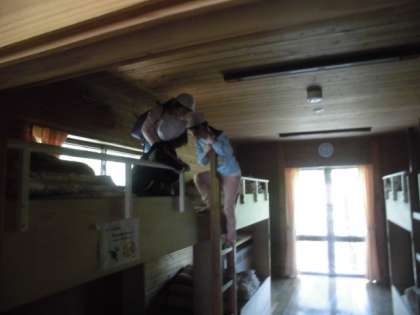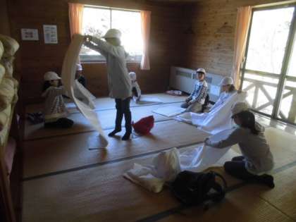 昼食のあと,シーツを受け取って寝具の準備をしました。この後,グループごとの山の家探検が始まります。