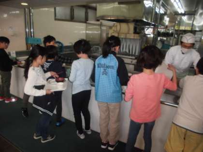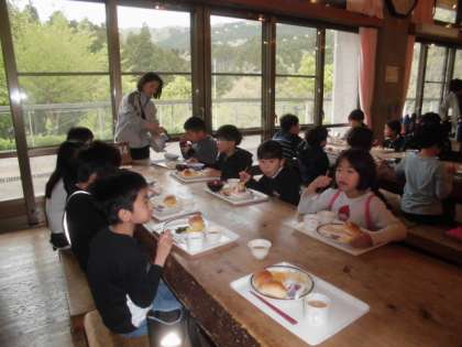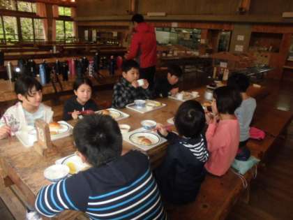 時間制でいただくので,朝食は広い食堂に洛中小学校児童だけです。冒険の森のアスレチックを楽しみにしている児童も多いのでしっかり食べて活動準備をします。
