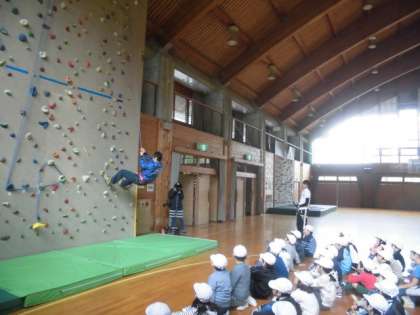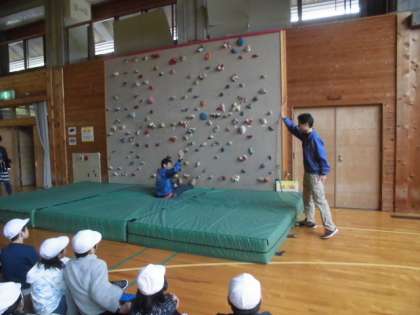 いよいよ「ボルダリング」「クライミング」の時間です。石原先生が講習を受けに来てくれたので実現しました。クライミングはそのやり方を知っている人が上手にアシストしてくれて初めて成功します。職員の方も上手に見本を見せてくれました。