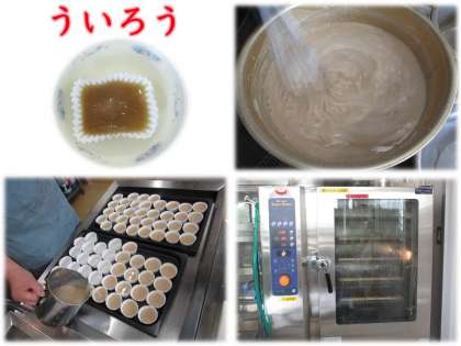 米粉・砂糖・黒砂糖・水を混ぜて1つずつカップに入れて,スチームコンベクションオーブンで蒸しました。