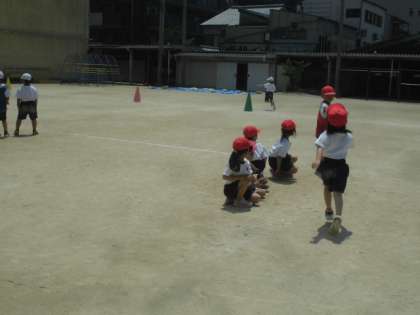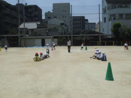 1年生の体育でリレーの学習をしています。まっすぐ走る事やコーンを素早く回ることなどいろいろ考えながら一生懸命走っています。友達を応援したり,ルールをきちんと守ることも大切な学習です。