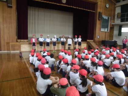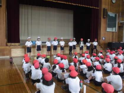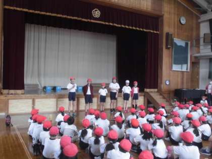 昨年度から通年で児童会役員を決め活動しています。本年度の計画委員,学級代表,各委員会の委員長の紹介がありました。