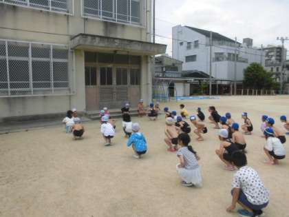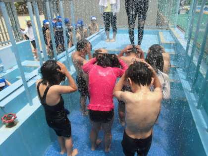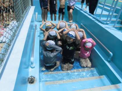 1,2年生の水遊びが始まりました。1年生は今日が初めてなのでプールサイドに行くまでの準備なども2年生がお手本になって教えてもらいました。
