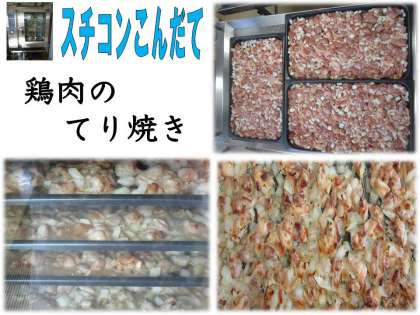 しょうゆやみりんなどの調味料で鶏肉をつけこみ,たまねぎといっしょにスチコンで焼きました。蒸し焼きにするので,鶏肉がふっくらと香ばしく焼けました。