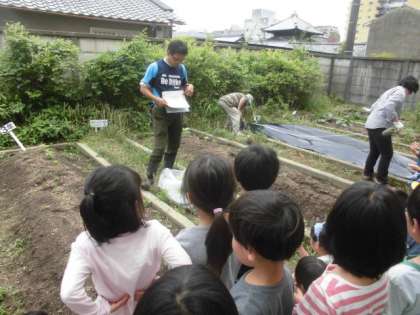 今年度は土嚢袋ではなく,畑に植えました。どちらが上でどちらを土にさしたらいいのかも確認しながら植えていました。