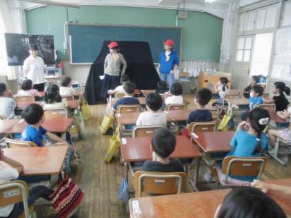京都食育キャラバン隊のみなさんに来ていただいて食育の指導をしていただきました。食べ物の3つの働きをお船に例えて,赤・黄・緑の食品をそろえることが大切である事,どんなものを食べるようにしたらいいのかを一緒に考えました。最後は給食メニューを見て3色のそろった栄養満点の給食をしっかり食べることが大事だとよく分かったようです。