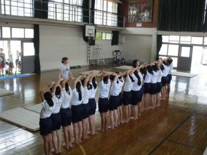 6年生は2回目なのでできる技も多いですが,2人,3人,5人…とみんなで力を合わせて作り上げる技の確認をしています。