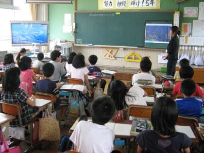 川と堤防に囲まれた岐阜県海津市の写真から,土地の特徴に気づき,人々のくらしについて話し合いました。