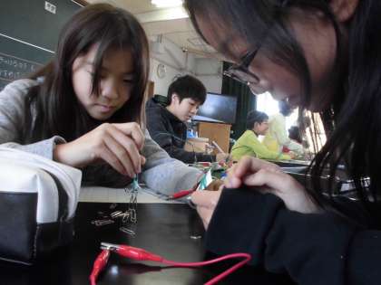 5年生は電磁石の性質について,電磁石が鉄を引きつける力をもっと強くするにはどうすればよいかを考え,確かめています。