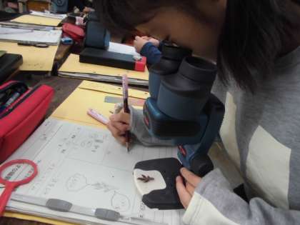 秋には赤・黄・オレンジ…と,とてもきれいな葉の色をしていましたが冬休みが明けるとほとんど葉がなくなっていました。枝をよく見て見ると,タケノコのような形のつぼみがあり,双眼実体顕微鏡で観察して記録しました。