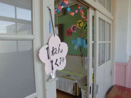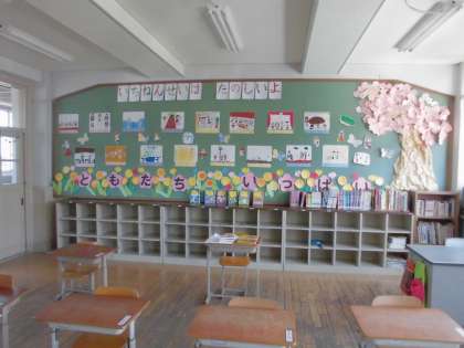 まずは3ねんせいのおへやがあって,そのとなりにみんなのおへやがあります。にゅうがくしきとそのつぎのひにはいりましたね。いまの2ねんせいのひとがかいてくれた えがかざってあります。じぶんの つくえには なまえがはってありましたね。らんどせるをいれるろっかあにもなまえがかいてあったよ。おぼえているかな。