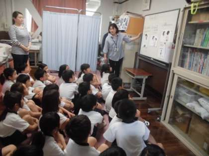 けがをしたり しんどくなったときに ようごきょうゆの せんせいが みてくださいます。いろいろなけんこうしんだんも します。けがをてあてするものや べっどもあります。