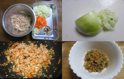 まぐろ油づけ160g たまねぎ1/4(85g) にんじん1/4(40g) しょうが ひとかけ(3g) しいたけ2枚 サラダ油適量 三温糖大さじ2/3 みりん小さじ1と1/3 料理酒小さじ1 こい口しょうゆ大さじ1
