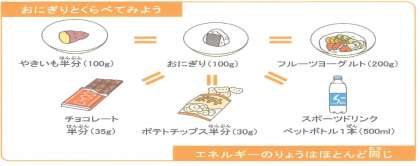 食べすぎて,たいせつな朝・昼・夕の食事が食べられないということがないように量を決めましょう。下のイラストも参考にしてください。