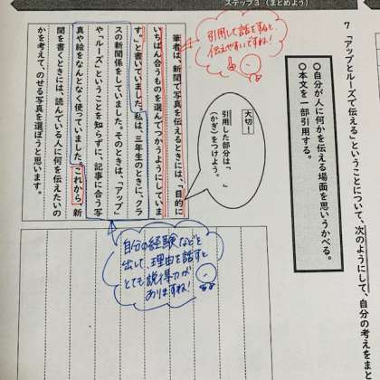 「アップとルーズで伝える」の中の文章をそのまま「引用」してから,自分の「経験」や新聞づくりなどの「具体例」を出すことによって,これからどのように生かしていくかを述べていますね。