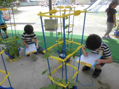 「わたしのおへそくらいまできてる。」「こっちはなふだまでのびてる!」「よくみるとけがはえてるね。」などと,気づいたことがたくさんありました。