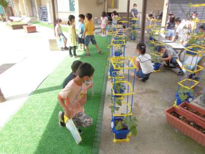 1年生のあさがおは 本葉が出てつるものびてきました。