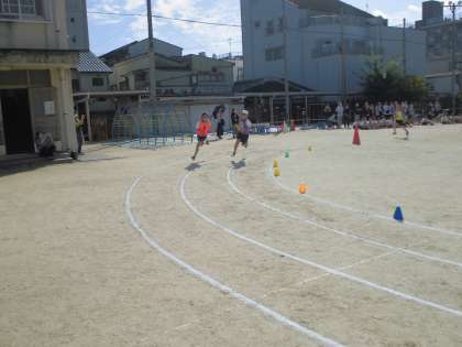 5年生2種目目はリレーです。バトンパスでは後ろの人を信頼し,前を見て走る練習を繰り返してきました。リレーは走力がほぼ同じチームを作ってバトンパスで勝敗が決まるように仕組んでいます。当日は8チームが3レースに分かれて試合をし,タイムで速さを競いました。