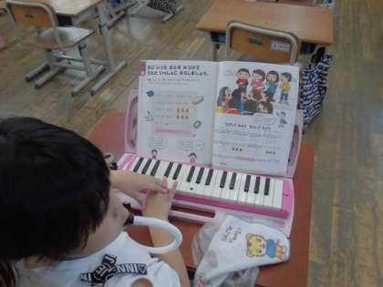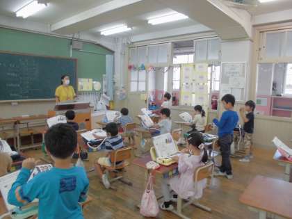 カスタネットやタンバリン,トライアングルを使って,音遊びをしています。歌を歌いながら決まったところで自分の担当の音を鳴らします。順番に回ってくる楽器を手にしてとてもうれしそうに演奏していました。