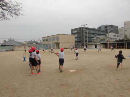 ベースボールの学習をしています。ルールを変えて,攻めるチームは打った後,距離が違う3つのコーンのどこを回ってくるかを判断しホームまで走ります。守るチームはボールを取った人を先頭にして全員一列に座ります。