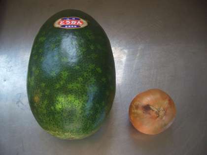 今日の給食に、夏野菜の「とうがん」を使った「とうがんのスープ煮」が登場しました。朝、給食室にとても立派な大きい冬瓜が届いていました。たまねぎと大きさを比べると・・・その大きさがわかりますね。