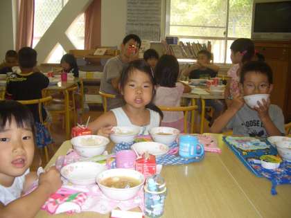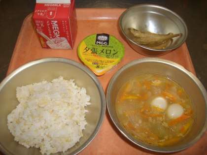 ランチルームで給食を食べていた1年生の子どもたち、初めて冬瓜を食べた感想は「なんだか大根みたい・・・」と言いながら食べていました。