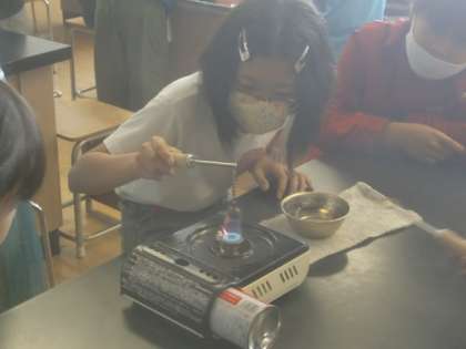4年生は「ものの温度と体積」の学習から,理科室で実験する機会が増えてきました。今日は,金属球をコンロで熱して体積の変化を調べました。全員がコンロに着火してみました。やけどをしないように気を付けながら実験を進めていきます。金属球を熱すると体積が大きくなるんだねっと,驚きの声が上がっていました。