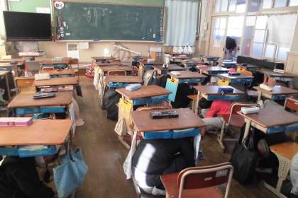 地震の警報を合図に,一斉に机の下に入り,机の脚をしっかり持っていました。