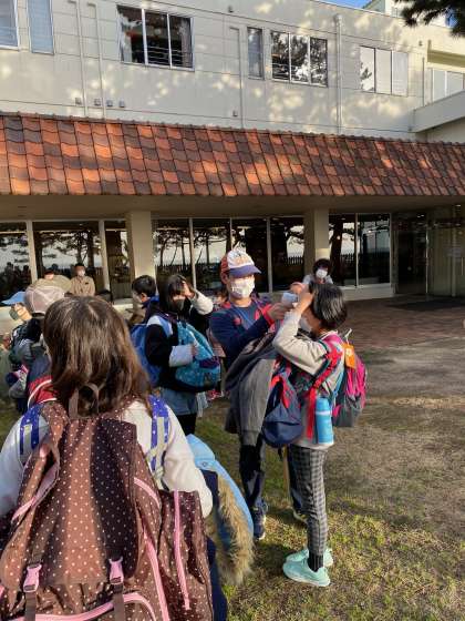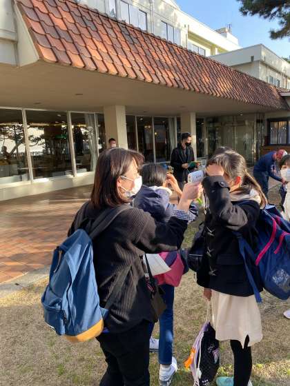 慶野松原壮に着きました。検温をして入館式を行います。