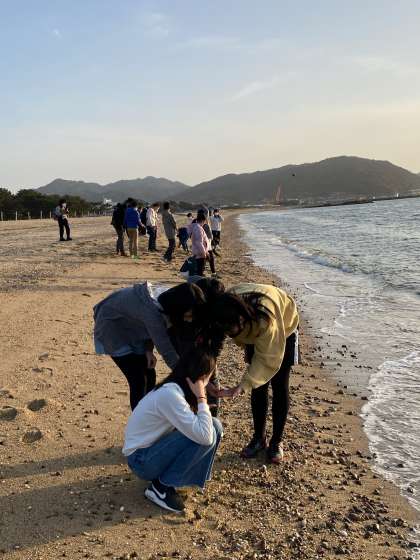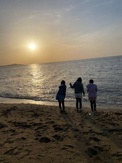 宿舎裏の砂浜を散歩しました。夕日がとてもきれいでした。