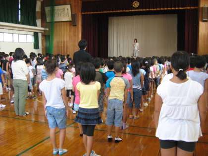 夏休み明け初めての朝会です。全校のみんなの元気な顔が久しぶりにそろいました。校長先生からは,生活リズムを取り戻そうというお話がありました。「早ね・早起き」「バランスのよい朝ごはん」「元気なあいさつ」を意識して,生活リズムを学校モードに戻していきましょう。そのあと,夏休み中の水泳記録会ですばらしい成績を残した6年生の表彰がありました。