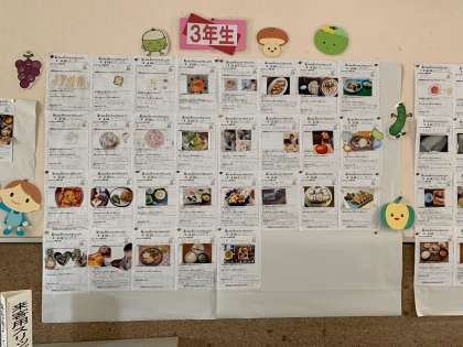 夏休みに実践していただいた朝ごはんづくりの用紙を学校の出入り口にある掲示板に,掲示しています。