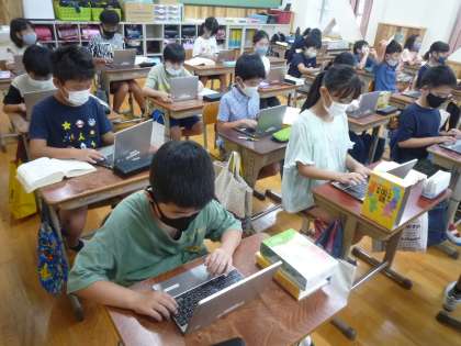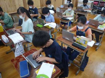国語の学習でロイロノートと辞書を使いながら,同じ読み方なのにいろいろな意味をもつ言葉を集めました。集めた言葉を使って,詩を作りました。おもしろい作品がたくさんできました。詳しくは今週の学級通信をご覧ください。