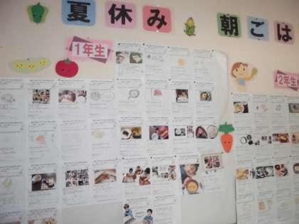 洛中小学校では毎年,食育から夏休みの宿題として「朝ごはんづくりに挑戦しよう!」という課題を出しています。(1〜4年生)今年もがんばって取り組んだ成果が集まりました。親子で楽しく朝ごはんづくりをした様子がよくわかります。