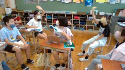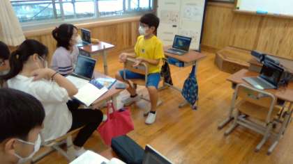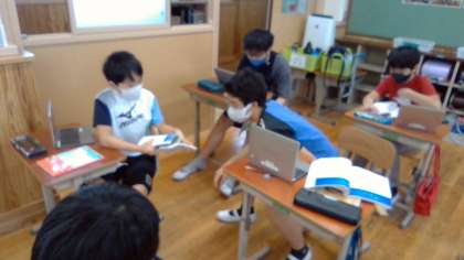 国語科の「やまなし」を通した学習では,グループごとに「問い」を持ち,話し合いながら「答え」を探る時間をとっています。子ども達は,「やまなしの叙述」「宮沢賢治という人物」「宮沢賢治の他の作品」などを基に,考えています。グループで考えを共有しやすいように自分たちで思考ツールを生かしながら話し合う姿も見られます。