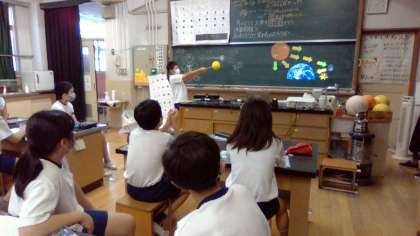 月の形が変わって見える理由を予想した後,ライトを太陽,ボールを月に見立てて,実験して確認しました。休み時間になっても,追加実験をする興味津々な姿も見られました。