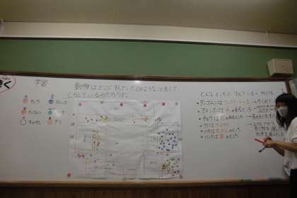 昆虫や動物たちの居た場所やなにをしていたのかを学校へ探しに行きました。その答えを,みんなで模造紙にまとめました。