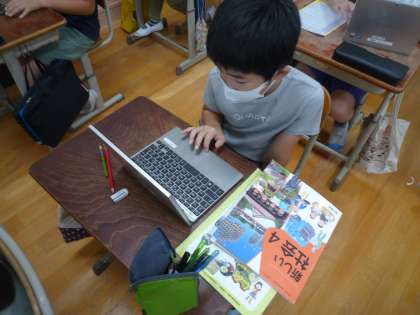 朝学習が終わったら,朝の会をしています。朝の会や帰りの会では係り活動の子どもたちからの連絡や先生からの連絡をしています。朝の会が終わったらすぐに授業を開始します。1時間目は社会の学習でパソコンを使って,調べ学習をしました。インターネットの使い方にも慣れてきているので,自分の調べたい内容のページを見つけて,ロイロノートにまとめていました。