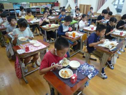 4時間目の授業が終わったら給食の時間です。「黙食」をしながら,放送委員会の放送を聞いて,給食を食べています。いつもおいしい給食を作ってくださる給食調理員さんに感謝しながら,味わって食べています。