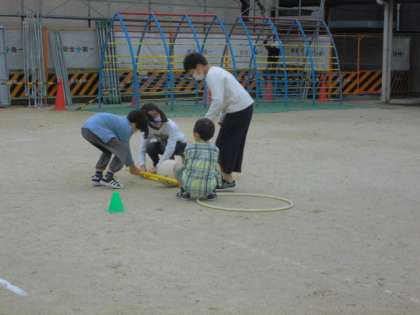 当日,1年生と6年生で協力して「バラエティー走」を行いました。ボールを棒でつかむのが難しかったり思っているよりも時間がかかったり・・・と想定外のことが起こっていたようですが,1年生も6年生も笑顔で仲良くなれてよい機会だったと思います。