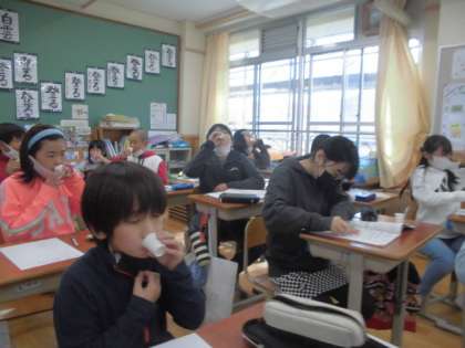 5年生はごはんとみそ汁の調理実習をしますが,それに向けてだしの学習もしています。前回は,こんぶだし・かつおだし・合わせだしを味わいましたが,今回は,みそを湯でといたものと合わせだしでといたものを飲み比べました。だしでといたものの方が,みその味が引き立ち,まろやかに感じるという意見が出ました。いよいよ次回は,具も入れて本格的なみそ汁を作っていきます。今までの学習をいかして,おいしいみそ汁をつくりましょう!