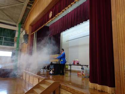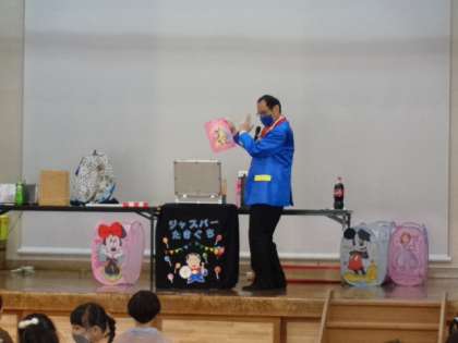 体育館では,マジックショーを楽しみました。ユーモアたっぷりの展開で,子どもたちも興味津々で見ていました。