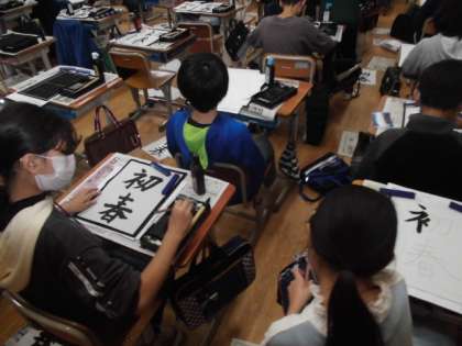 5年生は書初めで「初春」「世界の国」という字を書きました。