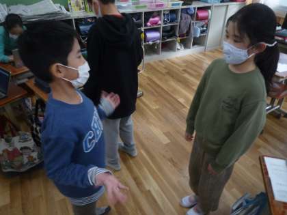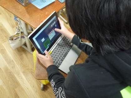 外国語の授業でロイロノートを活用してお店屋さんをしました。テーマは「自分だけのフルーツパフェを作ろう。」というもので,英語でお店屋さんに自分のほしいフルーツを伝え,お店屋さんがロイロノートを通して,お客さんにフルーツを送るというものです。デジタル上ですが,相手の目をみて,「Here you are.」「Thank you.」とやりとりをしていました。今後の学習で買い物をしたフルーツを使って,オリジナルパフェを作っていきます。