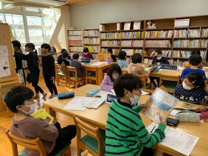 今日は図書室で,世界の民話や昔話を読んで,あらすじやどこの国のお話なのかを調べたり,紹介する文章を書いたりしました。