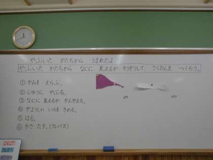 まずは,紙を破いてみて,その偶然の形から子どもたちは想像して作品を作りました。