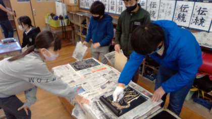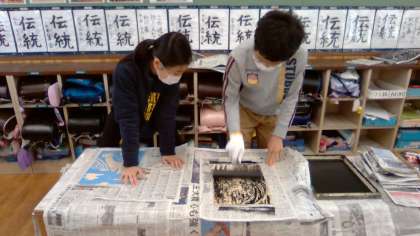 版画,刷りました。1度刷ってみて,仕上がりが自分のイメージと違うと,もう少し彫り進め,2度3度繰り返し刷りました。アドバイスし合ったり,作業を手伝ったり,しっかり協力もしていました。次回は,色を付けていきます。
